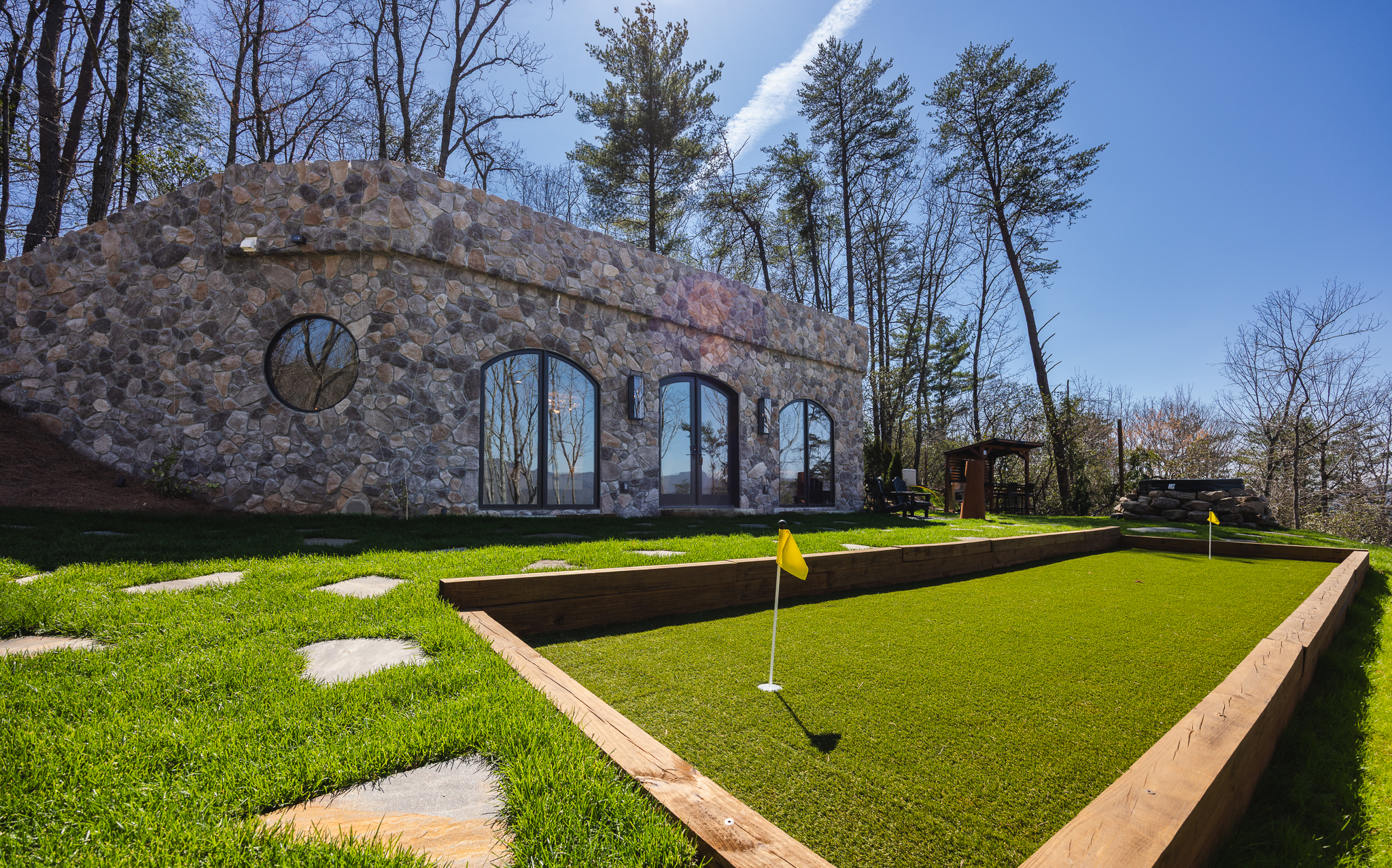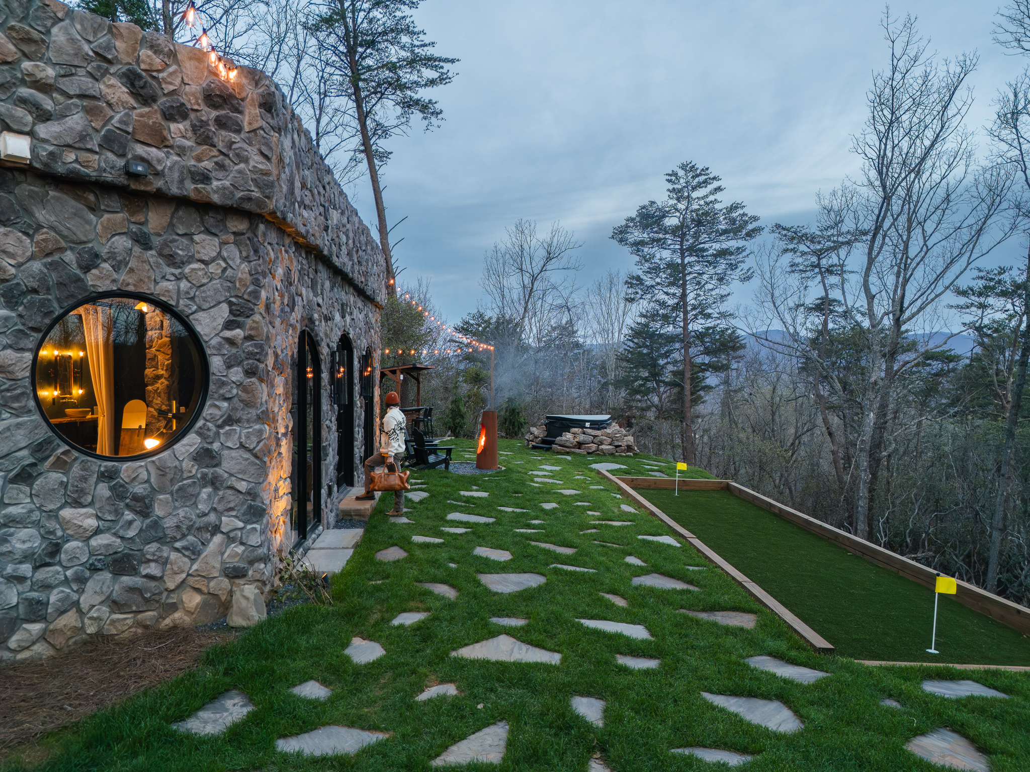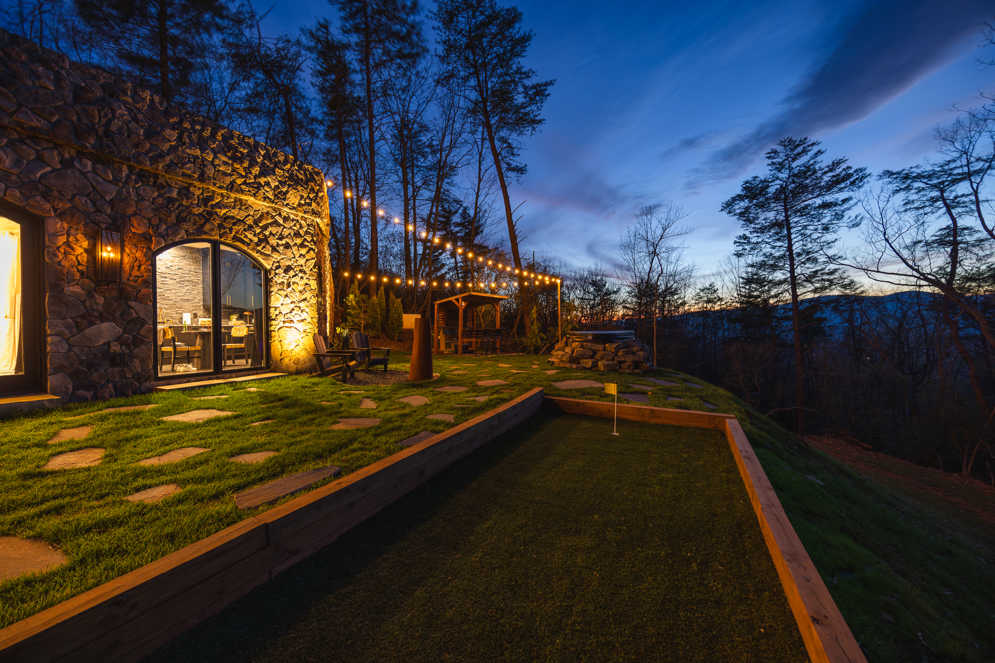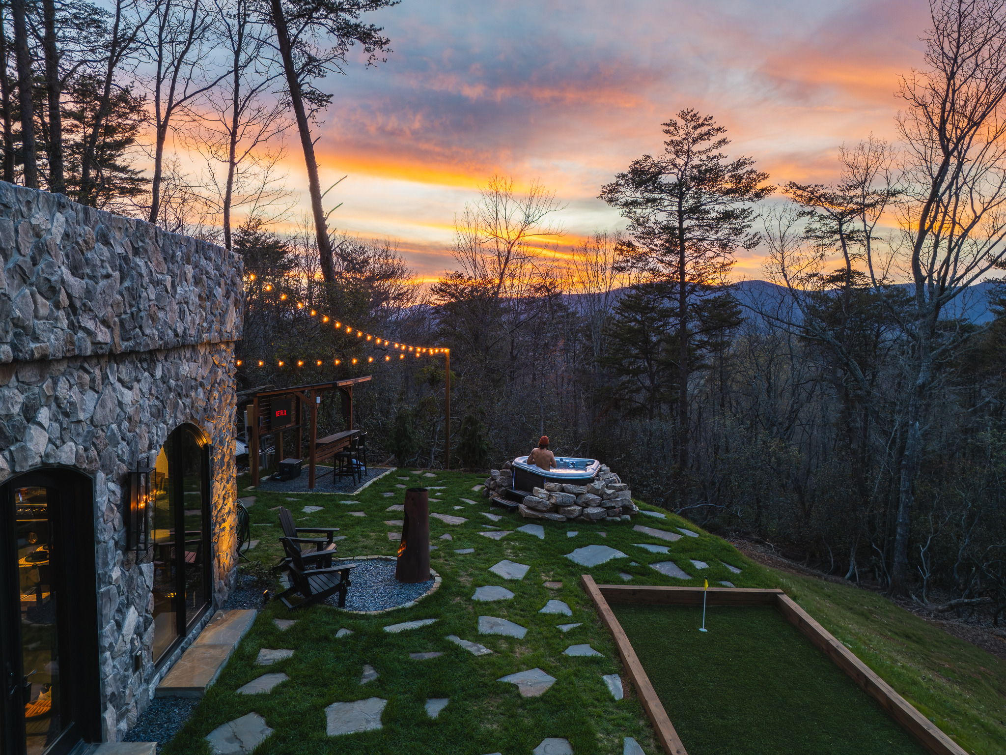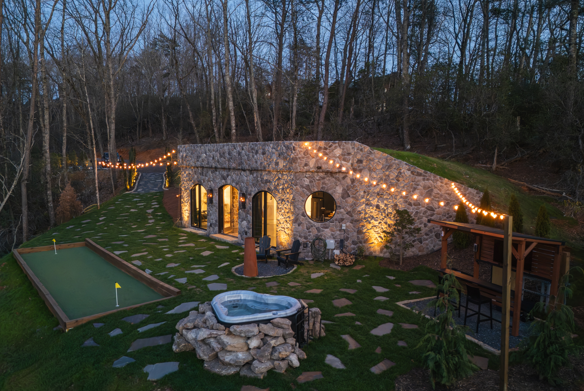 Step through fully operational floor-to-ceiling arch windows to your private oasis with sweeping mountain views. Sip cocktails at the custom outdoor bar, challenge each other to mini golf or bocce ball under string lights, or unwind in the bubbling hot tub. Stargaze in front of the firepit and let the 13-acre estate surround you in natural beauty.