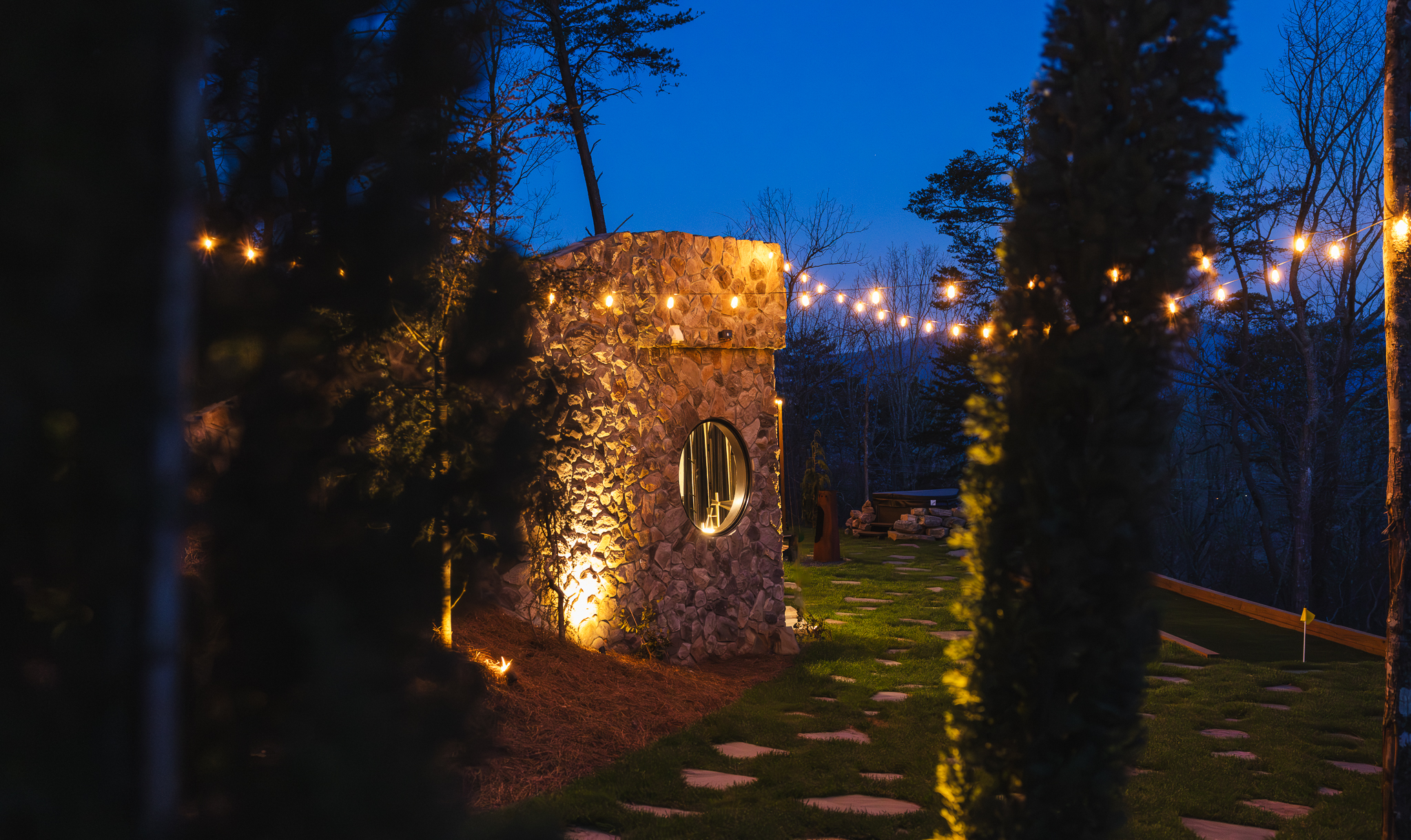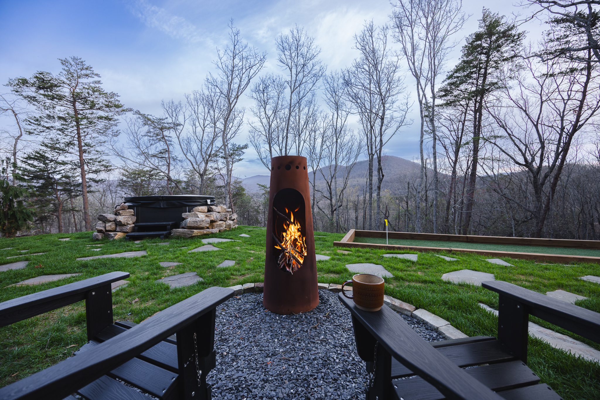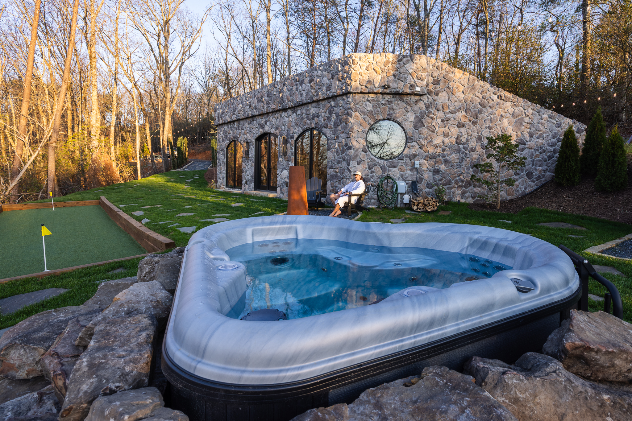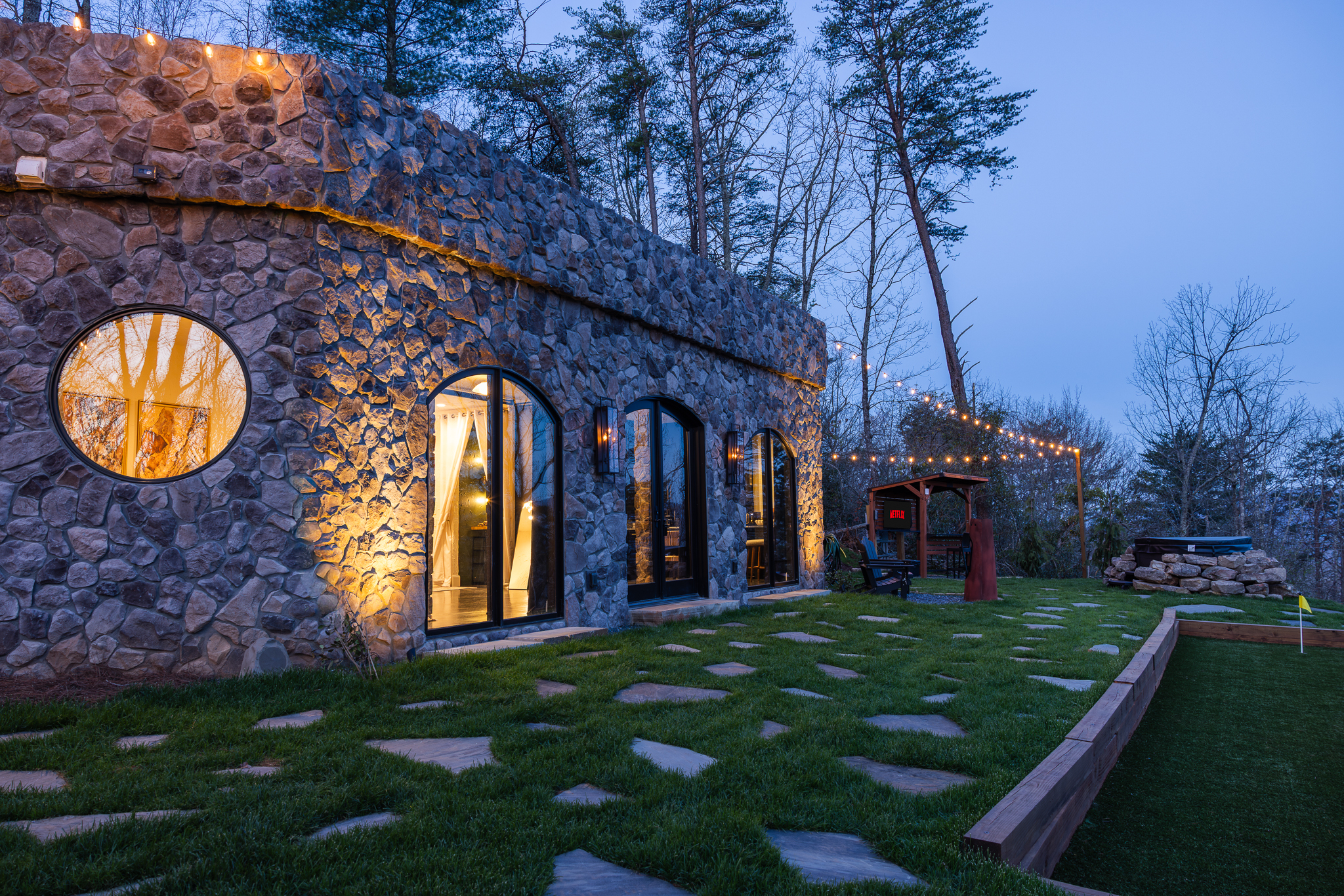 Step through fully operational floor-to-ceiling arch windows to your private oasis with sweeping mountain views. Sip cocktails at the custom outdoor bar, challenge each other to mini golf or bocce ball under string lights, or unwind in the bubbling hot tub. Stargaze in front of the firepit and let the 13-acre estate surround you in natural beauty.