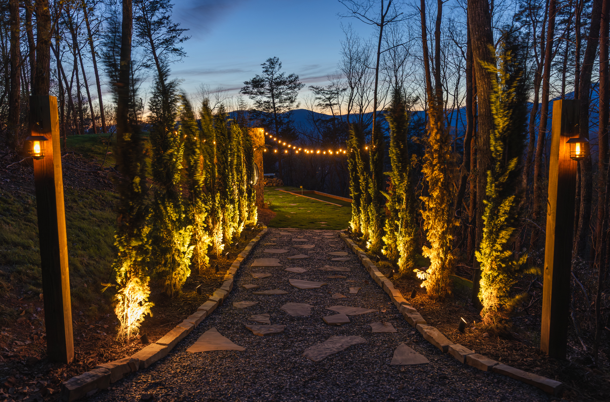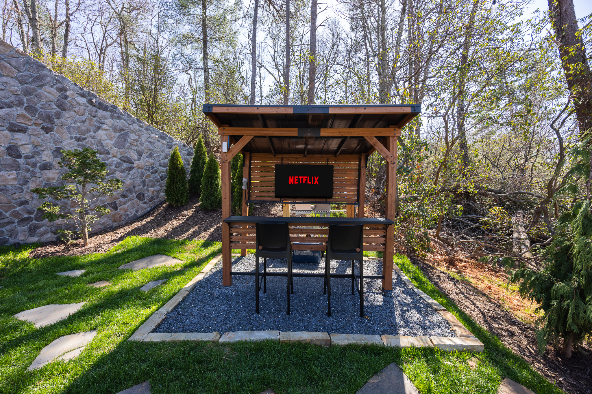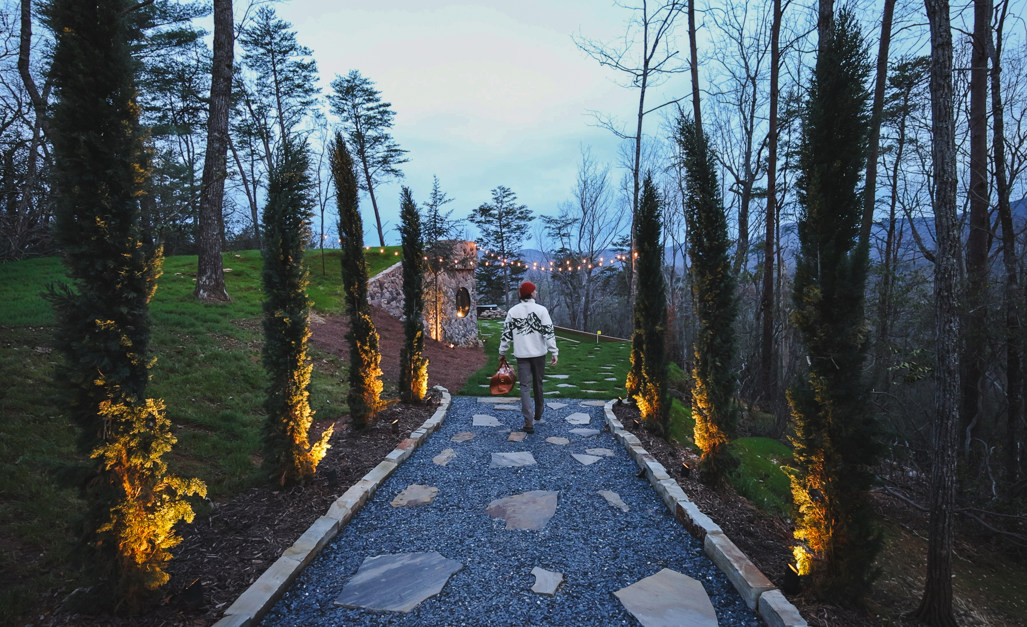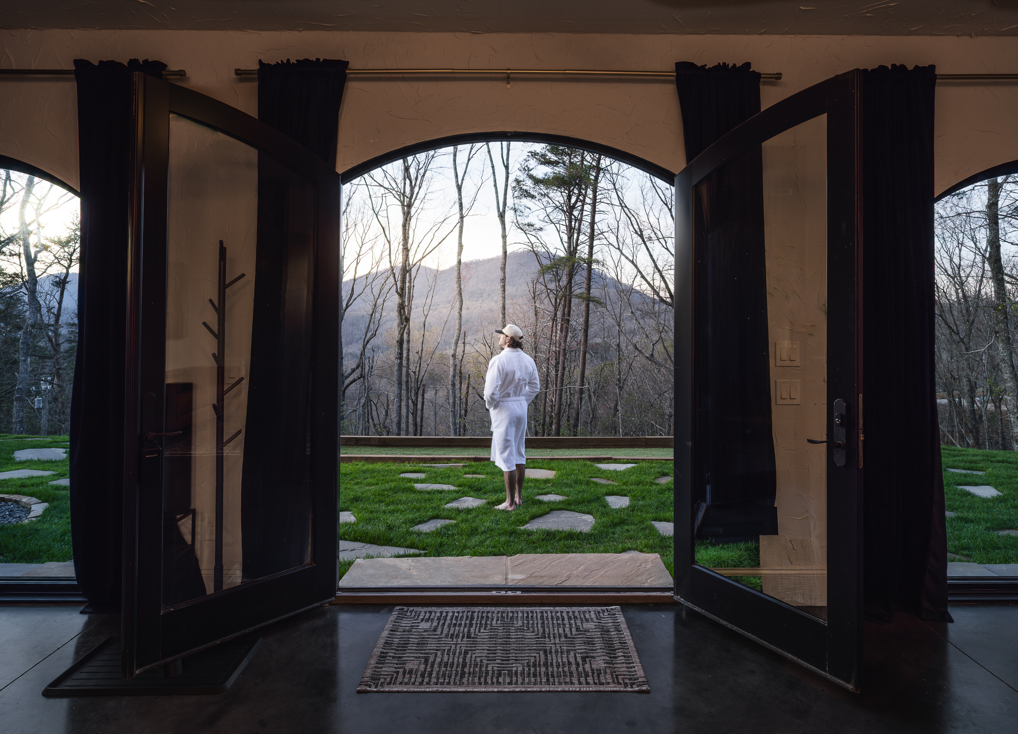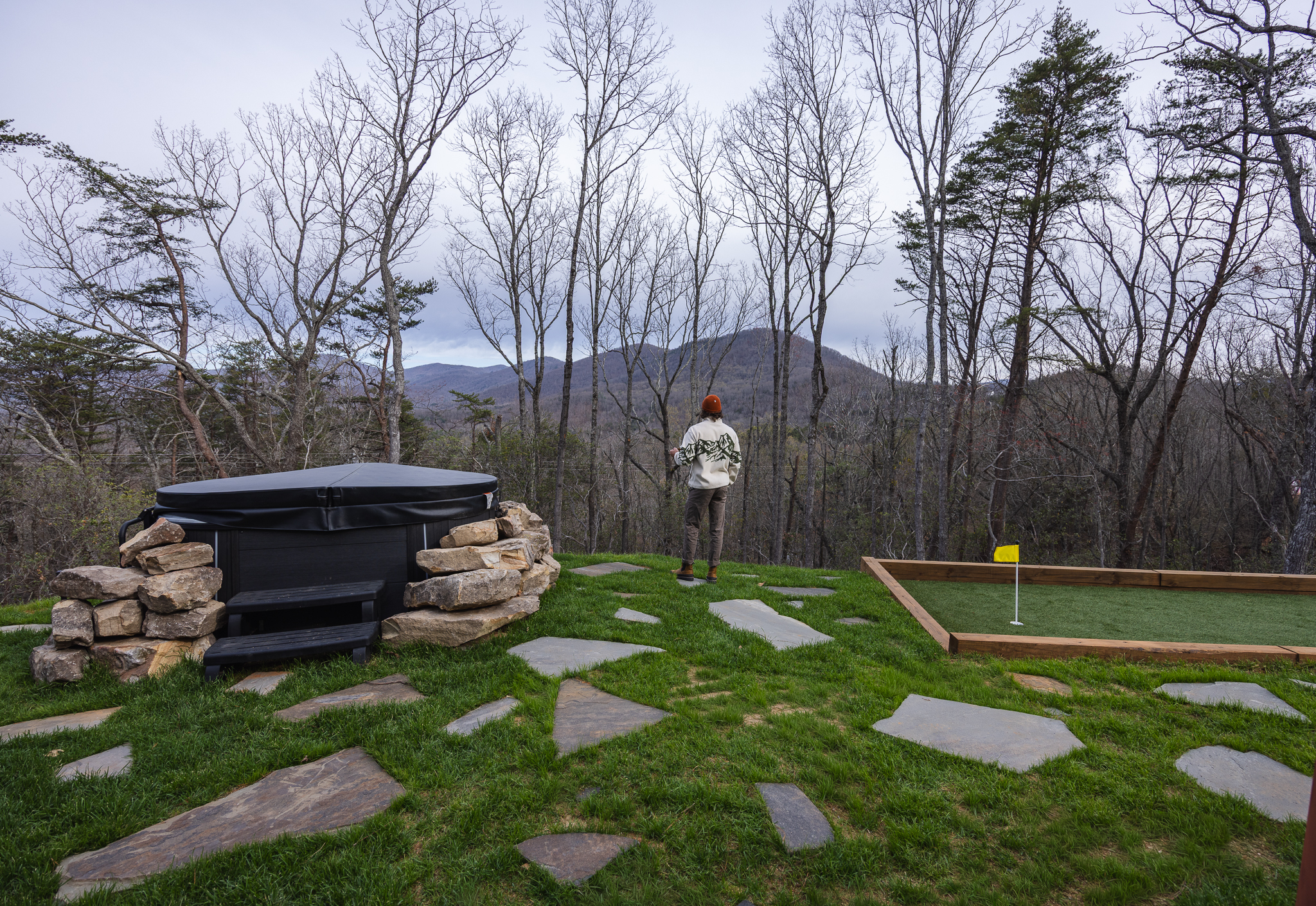 Step through fully operational floor-to-ceiling arch windows to your private oasis with sweeping mountain views. Sip cocktails at the custom outdoor bar, challenge each other to mini golf or bocce ball under string lights, or unwind in the bubbling hot tub. Stargaze in front of the firepit and let the 13-acre estate surround you in natural beauty.