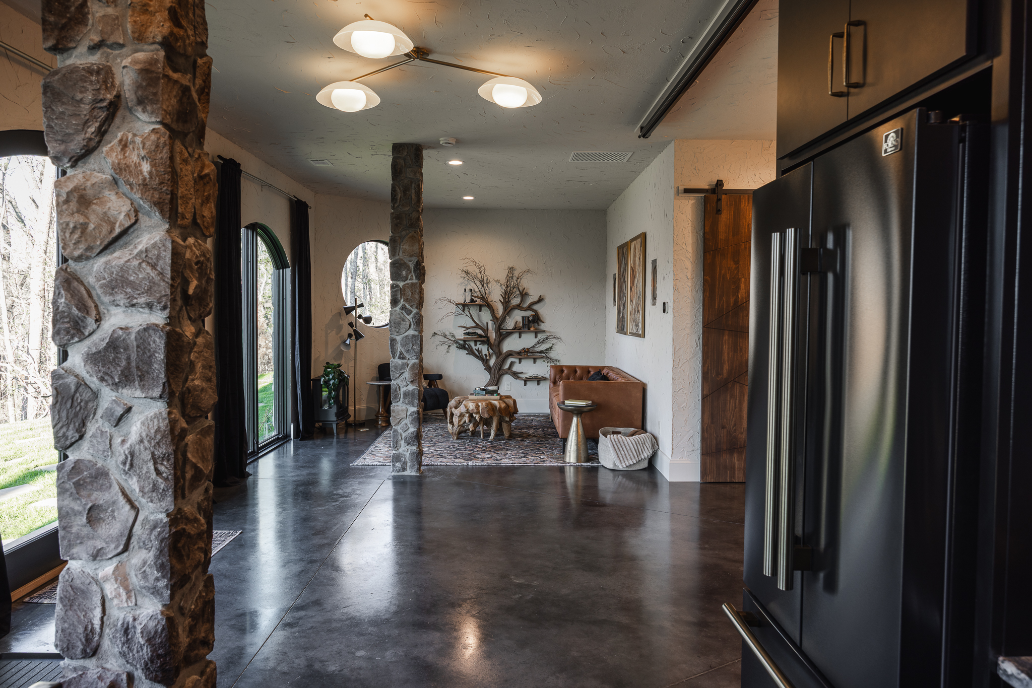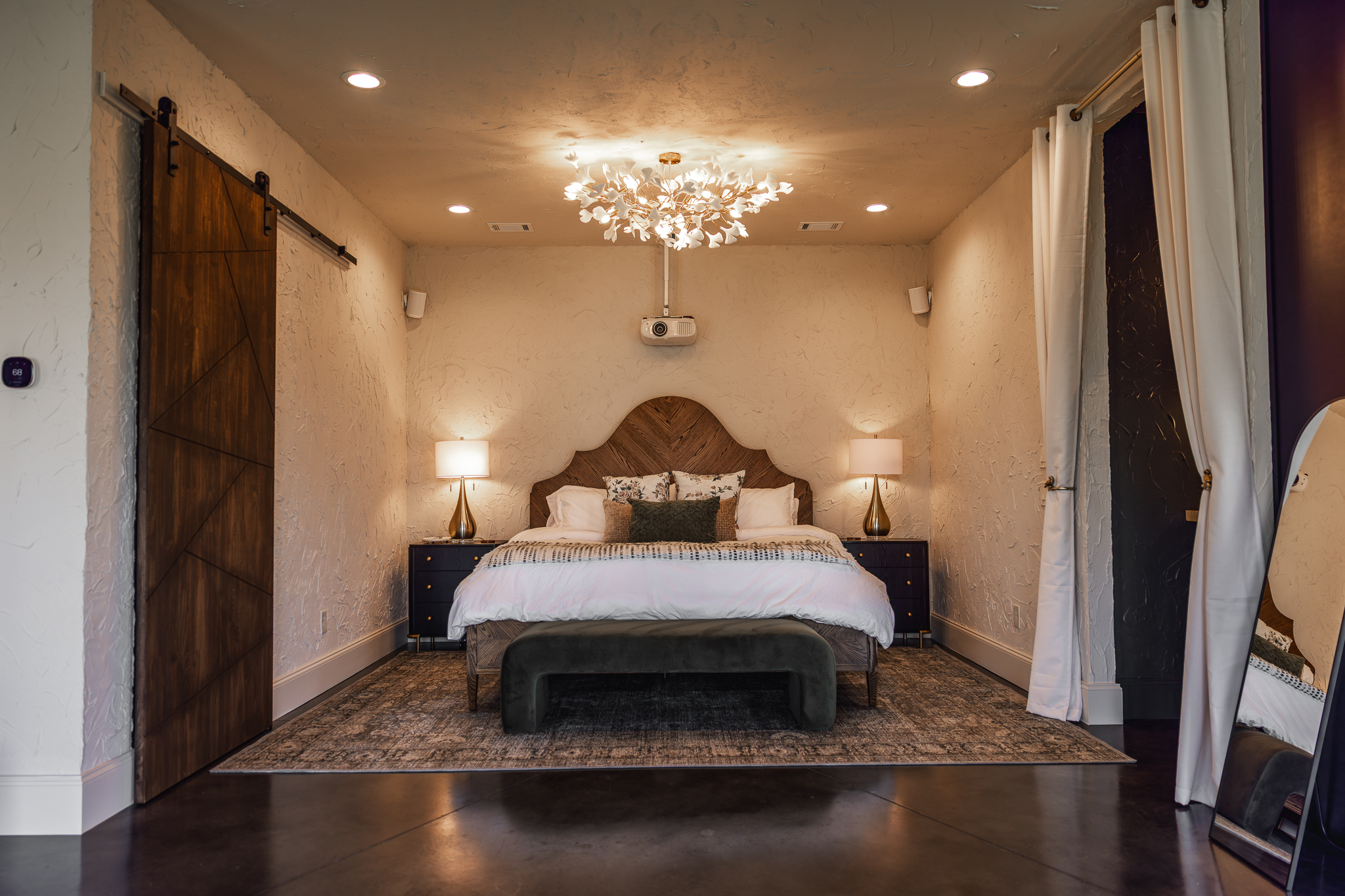 The single, luxurious bedroom is a romantic masterpiece. A king-size bed nestled within cave-chic walls, surrounded by soft textures, mood lighting and panoramic views through massive arch windows. High-end, name-brand mattress ensures cloud-like sleep in your private underground-inspired retreat. The state-of-the-art 120" drop-down movie screen is perfect for cinematic date nights inside your private cave.