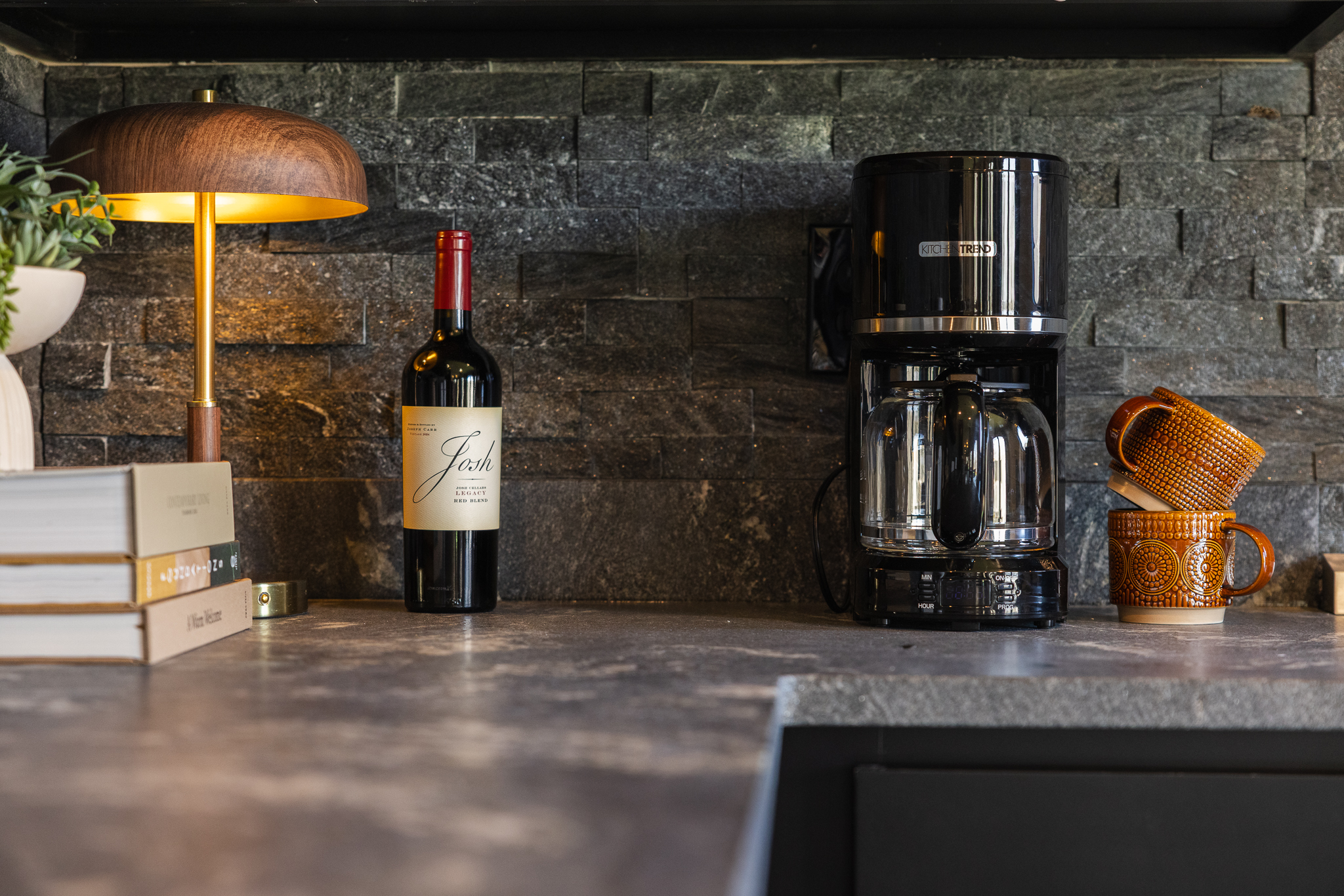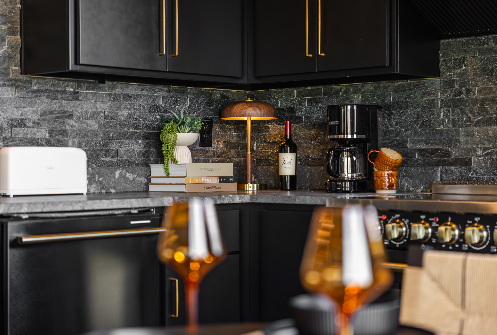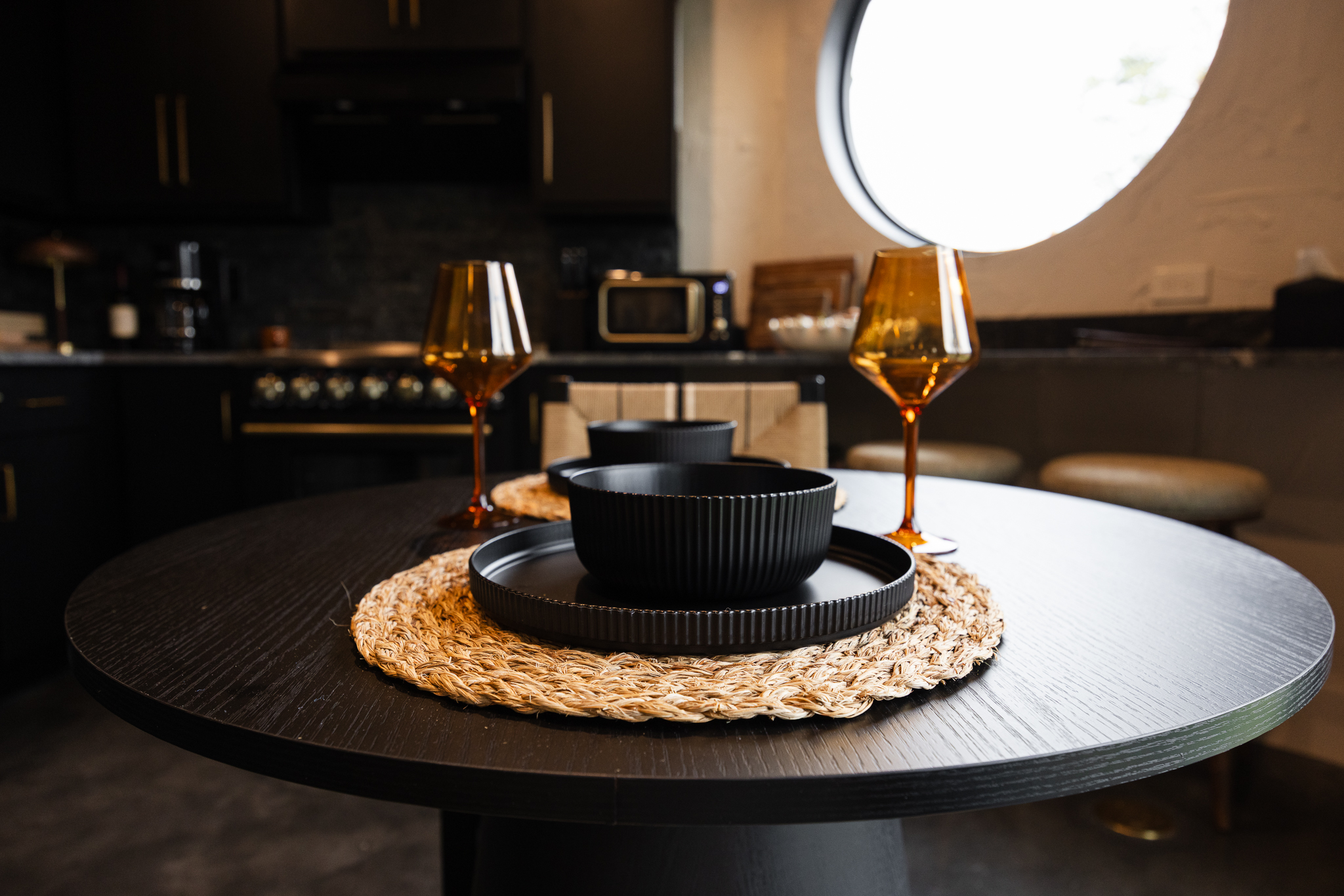 The fully equipped kitchen features all major appliances, sleek countertops and everything needed for intimate meals or midnight snacks. It flows seamlessly into a cozy seating area with plush furnishings, mood lighting.