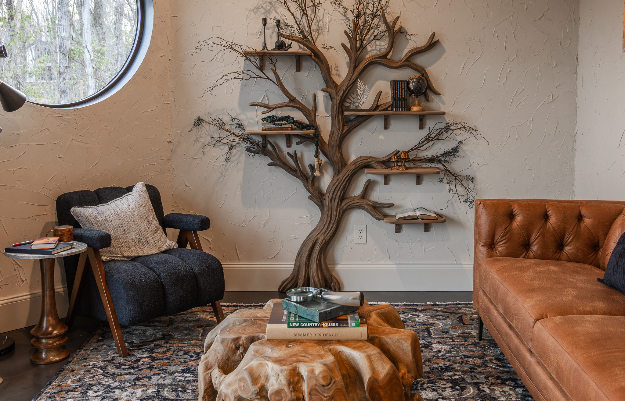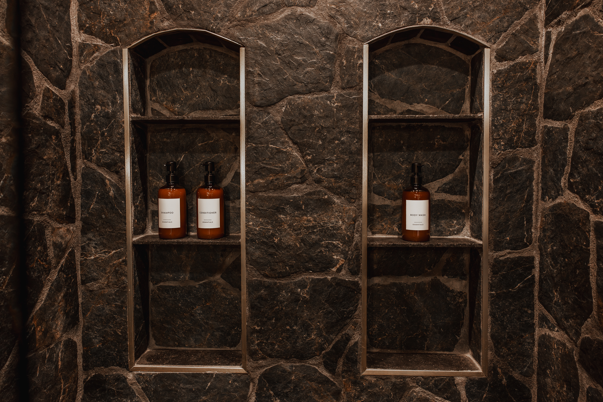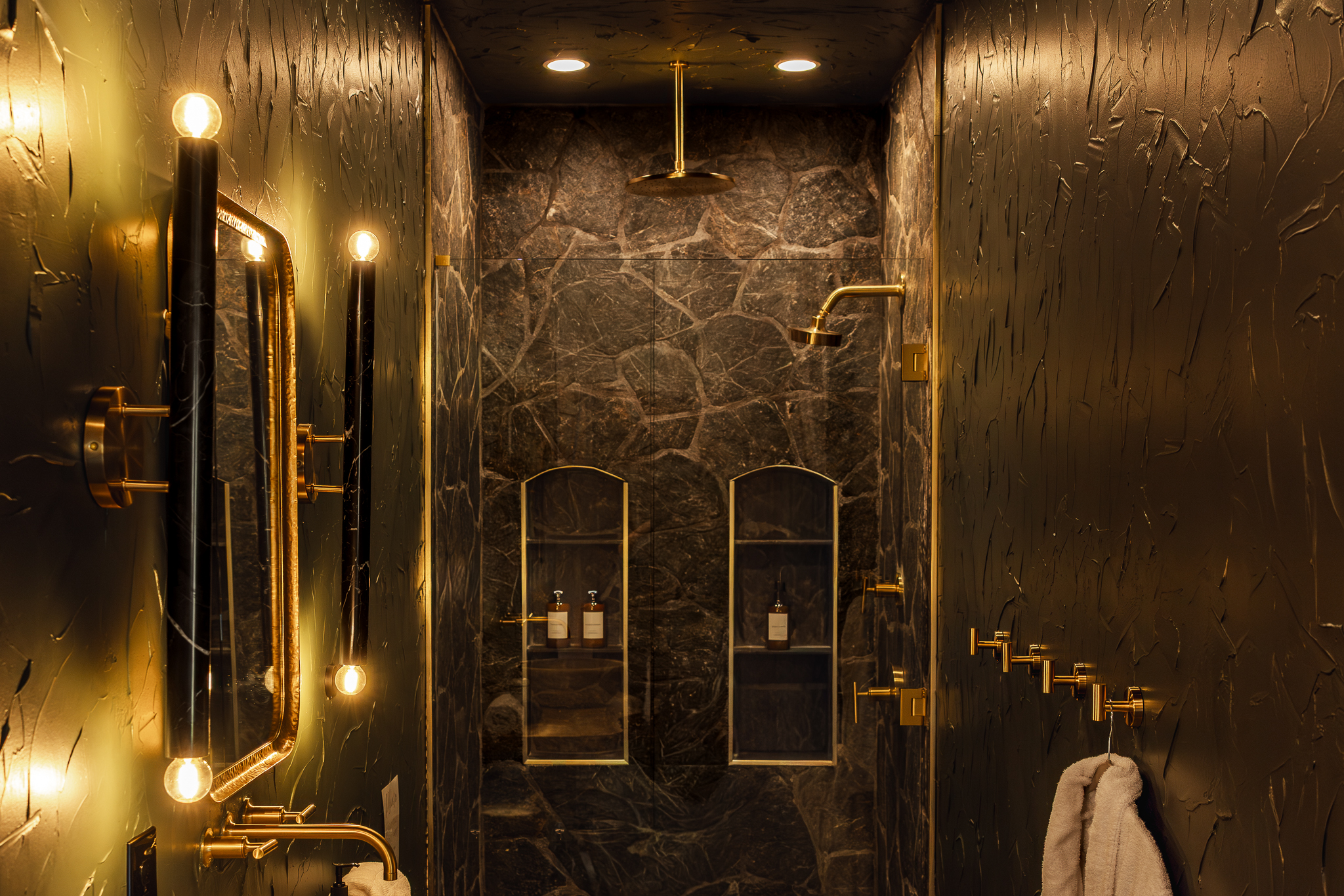 One full bathroom designed like a hidden grotto: rainfall shower, artisanal tile, luxury towels, and premium bath products for a spa-like escape.